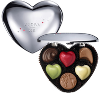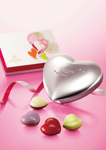 「デュオゴディバ」と人気のフレーバーをハート型のパッケージに詰め合わせました。2011年の刻印とカラフルなラインストーンがキュート。